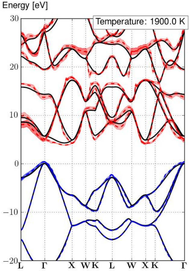 Using the relatively dense q-grid of 43x43x43 we can obtain the following converged bandstructure, at a high temperature (1900K):